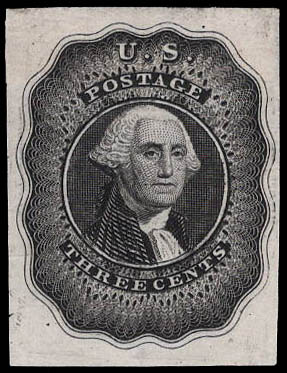 Lot 222 E 1851, 3¢ Washington essay, by Bald, Cousland & Co., in black (Scott 11-E14Ab. Brazer 33E-La), die on India paper, cut from the complete die of 3 different designs, Very Fine. The complete die catalogs $1,000, the single is unpriced by Scott. Estimate $60 - 80. |