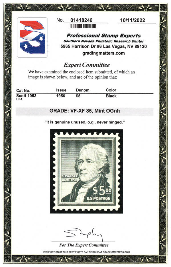 1956, $5 Hamilton (Scott 1053), o.g., never hinged, Very Fine to Extremely Fine, with 2022 P.S.E. certificate graded VF-XF 85. Scott $48. SMQ $50.