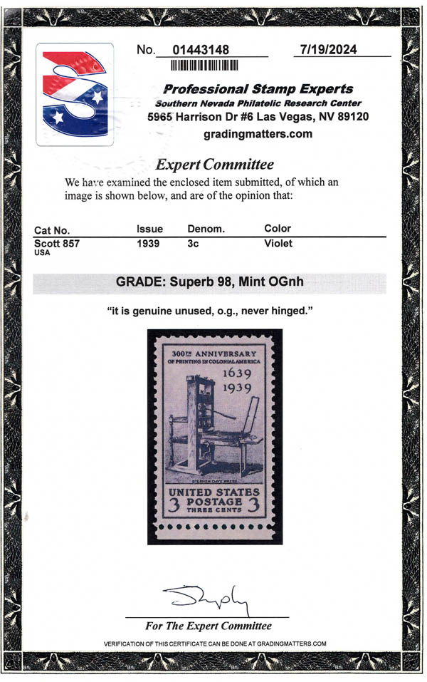 Lot 236![]() ![]() 1925-50, a high quality graded group of 5 (Scott 553//990), including Sc. #553 (VF-XF 85), 857 (SUP 98), 984 (XF-SUP 95), 988 (XF-SUP 95), 990 (SUP 98), five lovely commemoratives with outstanding centering, o.g., never hinged, all with 2024 P.S.E. graded certificates. SMQ $220. Estimate $75 - 100. |