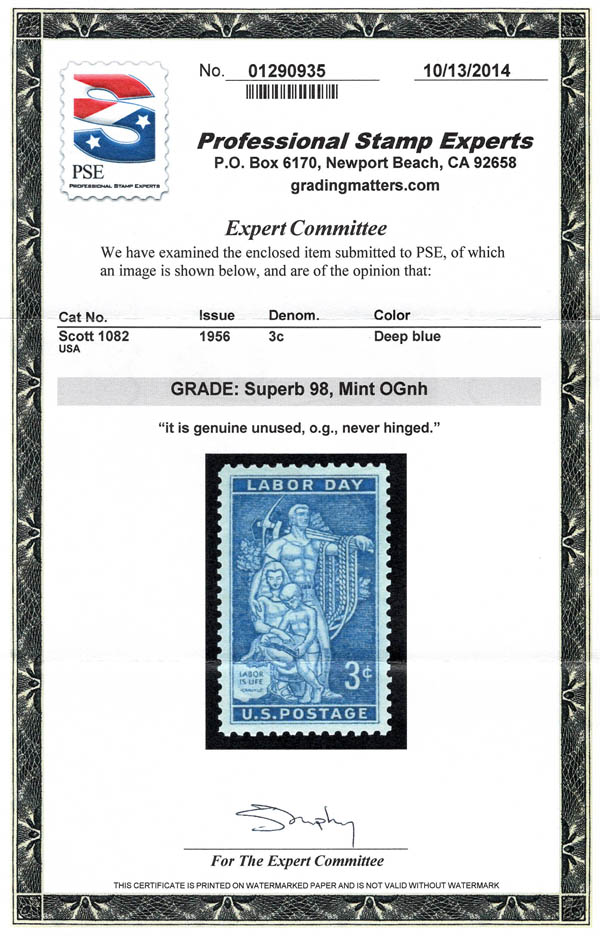 1956, 3¢ Labor Day (Scott 1082), o.g., never hinged, Superb, with 2014 P.S.E. certificate graded SUP 98. SMQ $60.