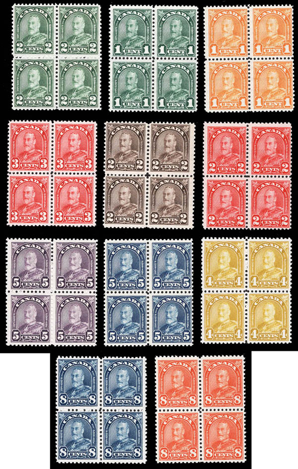 Lot 24![]() ![]() ![]() Canada, 1930, King George V "Maple Leaf", 1¢ orange through 8¢ red orange (Scott 162-172), blocks of 4, vibrant color and impression, all well centered; not a complete set but a great start! o.g., never hinged, Very Fine. Scott $622. Estimate $120 - 150. |