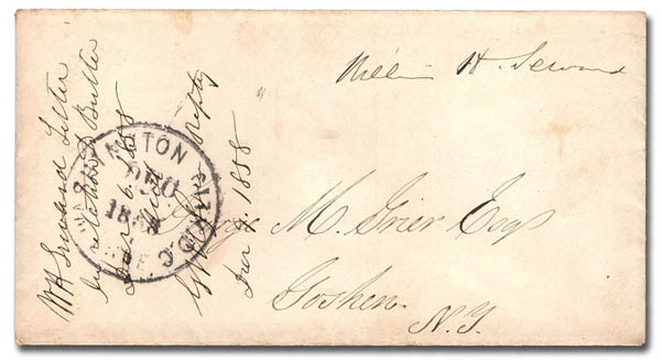 Lot 24 Seward, William H., (1801-1872), an American politician who served as U.S. Secretary of State under Presidents Lincoln and Johnson from 1861 to 1869, and earlier served as governor of New York and as a United States senator. Free franked letter dated Dec. 6 1858 (Washington DC c.d.s. cancel) with his notations at the side requesting what appears to be a reply by Dec. 9, 1858; so this letter is actually signed twice by him during his time as a U.S. Senator. Estimate $350 - 500. |