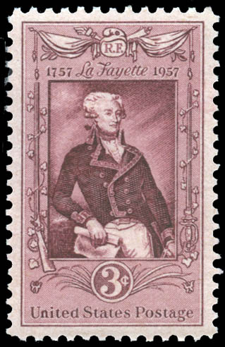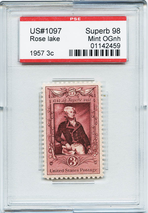 1957, 3¢ Lafayette (Scott 1097), perfect centering, o.g., never hinged, Superb, with encapsulated P.S.E. certificate graded SUP 98. SMQ $75.
