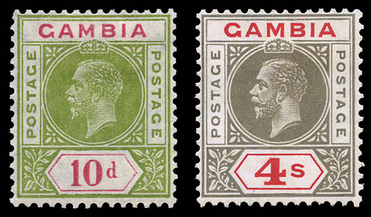 Lot 244![]() Gambia, 1921-22, King George V, ½d to 4s complete, Multiple Script CA watermark (SG 108/117. Scott 87-96), set of 10, o.g., lightly hinged, 2½d with trivial thin, Fine to Very Fine overall. SG £110 ($140). Scott $139. Estimate $40 - 60. |