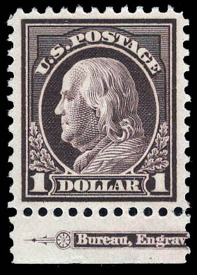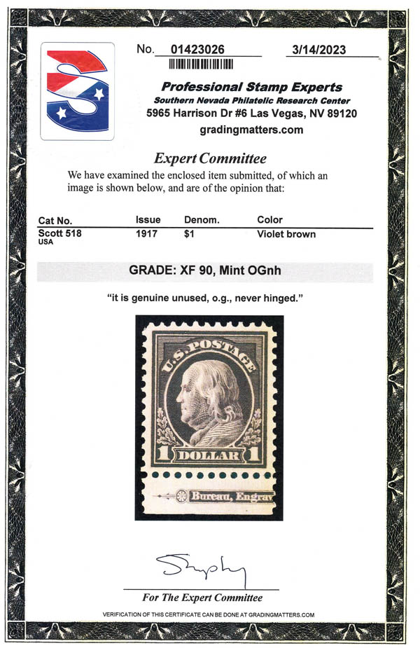 Lot 256![]() ![]() 1917, $1 Franklin, violet brown, perf. 11 (Scott 518), part imprint single, uncommonly choice, o.g., never hinged, Extremely Fine, with 2023 P.S.E. certificate graded XF 90. Scott $95. SMQ $150. Estimate $100 - 150. |