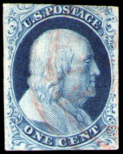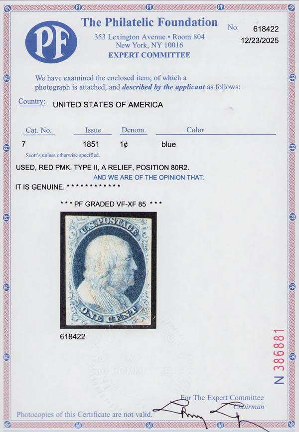 Lot 26 o 1851, 1¢ Franklin, blue, type II (Scott 7), position 80R2, ample margins, Very Fine to Extremely Fine, with 2025 P.F. certificate graded VF-XF 85. Scott $140. SMQ $190. Scott Stamp Values $215. Estimate $120 - 180. |
