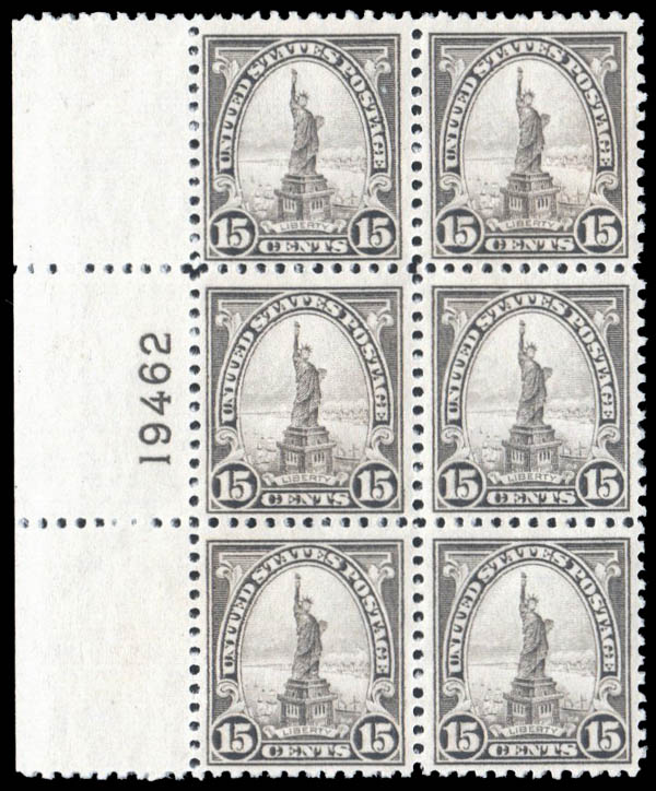 1922, 15¢ gray (Scott 566), plate block of 6, a lovely multiple, o.g., never hinged, Very Fine.