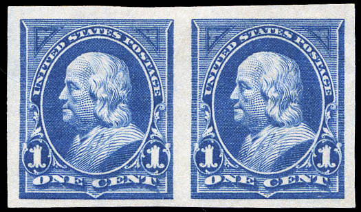 1895, 1¢ Franklin, D.L. watermark, imperforate proof on stamp paper (Scott 264P5), horizontal pair, o.g., hinged, Very Fine. Scott $275.