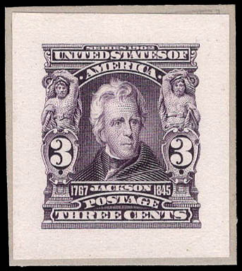 1903, 3¢ Jackson, "Roosevelt" small die proof (Scott 302P2), Extremely Fine. Scott $300.