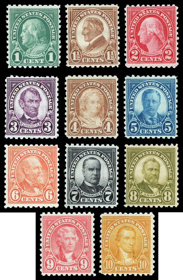 1923-26, Rotary press definitives, perf. 10, 1¢ to 10¢ complete (Scott 581-591), set of 11, o.g., never hinged, Fine to Very Fine. Scott $376.