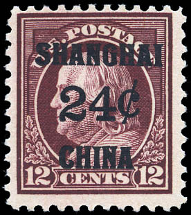 Offices in China, 1919, 24¢ on 12¢ brown carmine (Scott K11), o.g., never hinged, Fine. Scott $150.