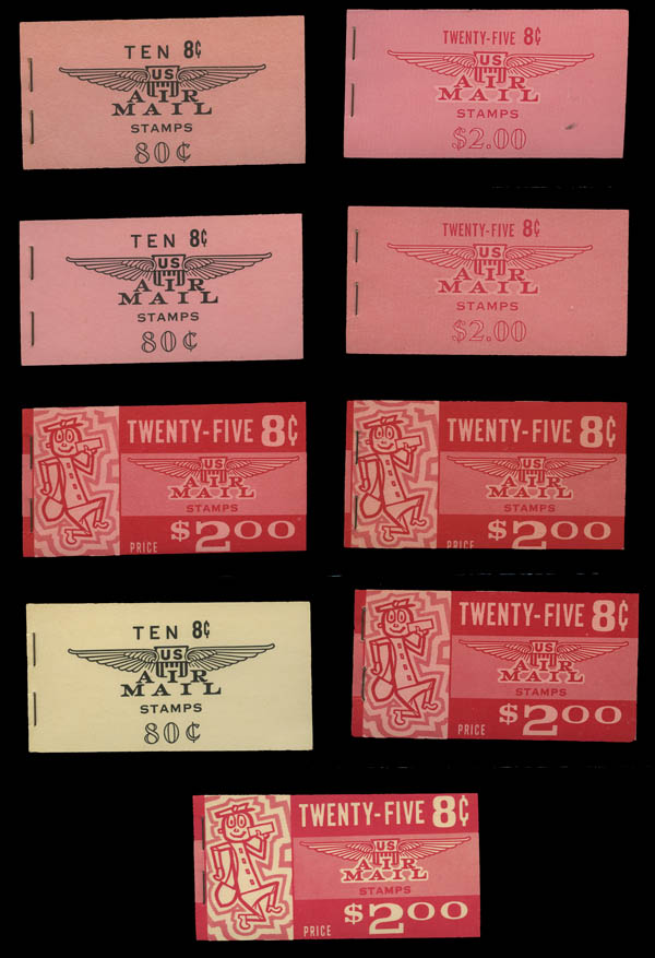 Lot 276![]() ![]() Airmail Booklets, 1963-64, a selection of 9 different better complete booklets (Scott BKC9//BKC19), including BKC9 ($21), BKC10 9 ($32.50), BKC11 ($30), BKC12 ($275), BKC13 ($300), BKC15 ($100), BKC16 ($65), BKC18 ($350) and BKC19 ($11.50), o.g., never hinged, generally Fine to Very Fine. Scott $1,185. Estimate $300 - 400. |