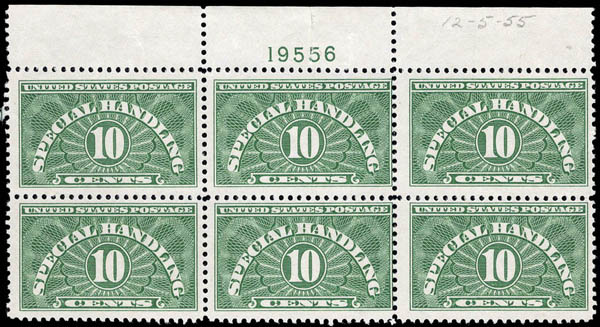Special Handling, 1955, 10¢ light green, dry printing (Scott QE1b), plate block of 6, o.g., stamps never hinged, hinged in selvage only, Fine to Very Fine. Scott $75.