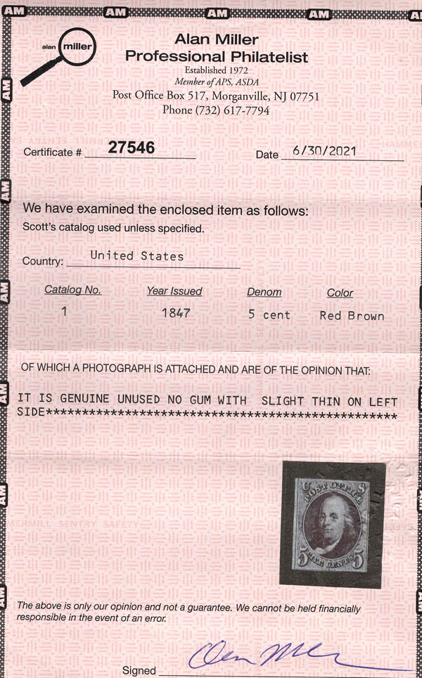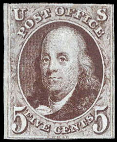 1847, 5¢ Franklin, brown (Scott 1 var.), ample margins to just touching, unused without gum; slight thin at left, otherwise nearly Fine, Miller certificate. Scott $2,100.