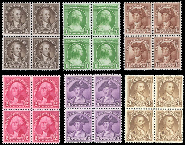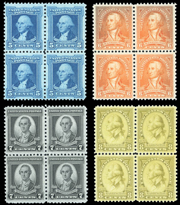 1932, Washington Bicentennial complete (Scott 704-715), set of 12, blocks of 4, well centered throughout, o.g., never hinged, Very Fine or better. Scott $133.