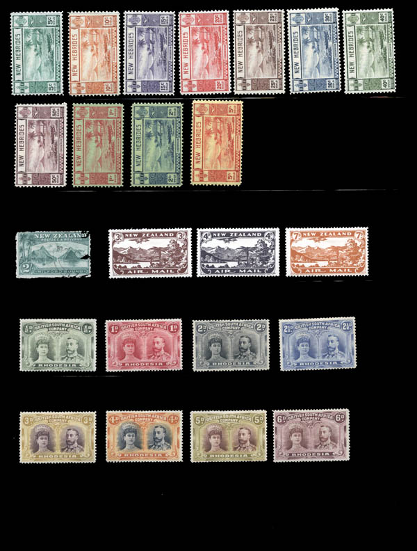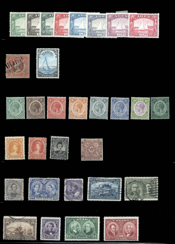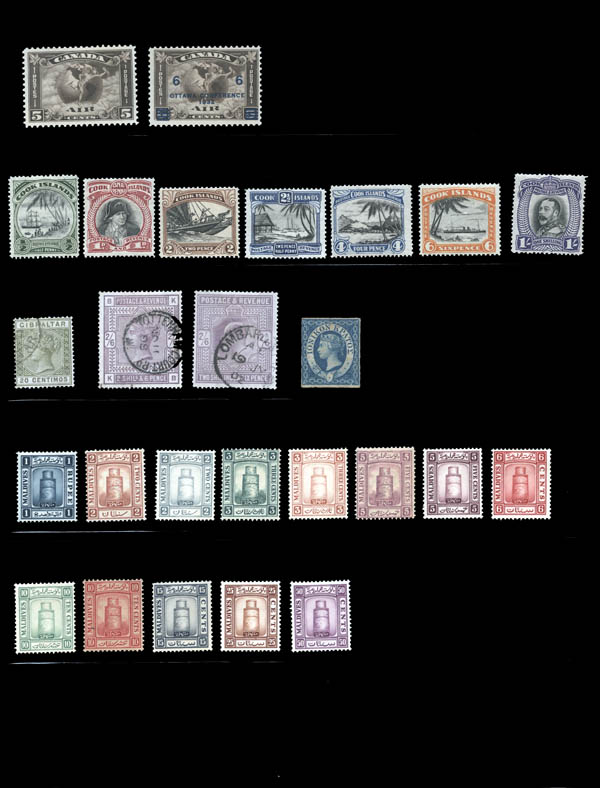 Lot 30![]() British Commonwealth, 1850-1940, selection of better sets and singles, including: Aden #1-8 Dhow part set mint OG FVF ($78); New South Wales #31 VF used ($140); Bermuda #109 mint OG FVF ($55); British Honduras #92-99 KGV part set mint OG FVF ($99); New Brunswick #7 mint dist. OG XF ($20), #9 mint OG VF ($55), #11 FVF used ($65); Newfoundland #19 mint OG VF ($75); Canada #17 Fine used ($175), #60 50¢ Jubilee mint HR FVF ($375), #95 50¢ KE7 XF used ($175), #99 5¢ Quebec VF used ($70), #100 7¢ Quebec FVF used ($100), #103 20¢ Quebec Fine used ($225), #146-148 Confederation NH FVF ($75.25), #C2 OG VF ($45), #C4 OG HR FVF ($32.50); Cook Islands #84-90 KGV set mint FVF ($86); Gibraltar #31 QV Fine used ($100); Great Britain #96 QV 2s6d FVF used ($165), 139 KE7 2s6d VF used ($150); Ionian Islands #2 mint dist. OG ($57.50); Maldives #7-19 definitives mint OG (some aged OG) FVF ($88); New Hebrides #50-60 part set mint OG FVF ($87); New Zealand #97 Milford Sound 2/- Fine used ($60), C1-3 mint HR VF ($85); Rhodesia 101-108 Double Heads part set mint HR FVF ($377.50); and Sarawak 94-108 definitives mint HR FVF ($142.50). Scott $3,259. Estimate $500 - 750. |