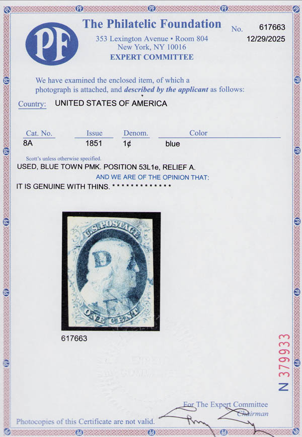 1851, 1¢ Franklin, blue, type IIIa (Scott 8A), position 53L1E, magnificent margins; thins, Extremely Fine to Superb appearance, with 2025 P.F. certificate. Scott $750.