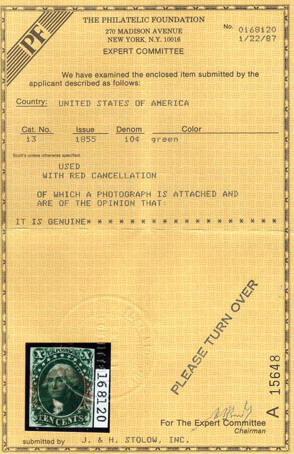 1855, 10¢ Washington, green, type I (Scott 13), premium red cancel, nearly Very Fine, with 1987 P.F. certificate. Scott $850.
