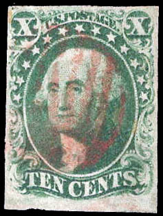 1855, 10¢ Washington, green, type II (Scott 14), with ample to large margins, with premium red cancel, Fine to Very Fine. Scott $170.