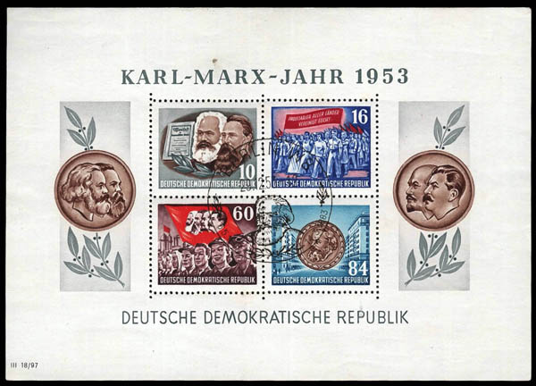 German Democratic Republic, 1953, Karl Marx Year souvenir sheet, perf'd (Scott 146a), Berlin c.d.s., Fine to Very Fine. Scott $175. Michel Block 9A; €220 ($240).