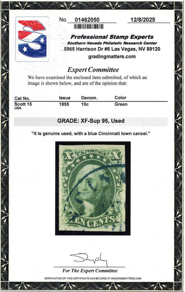 Lot 310 o 1855, 10¢ Washington, green, type III (Scott 15), mathematically precise centering amid lavish margins, blue Cincinnati, OH town cancel, Extremely Fine to Superb, with 2004 P.F. and 2025 P.S.E. certificates, the latter graded XF-SUP 95. Scott $155. SMQ $650. Estimate $400 - 600. |