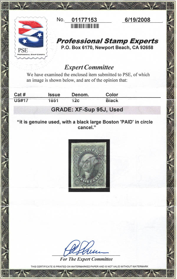 Lot 313 o 1851, 12¢ Washington, gray black (Scott 17), a magnificent gem example of this very difficult issue, with massive margins and razor sharp impression, black Boston PAID cancel, Extremely Fine to Superb, with 2008 P.S.E. certificate graded XF-SUP 95J. Scott $260. SMQ $2,000. Estimate $1,500 - 2,000. |