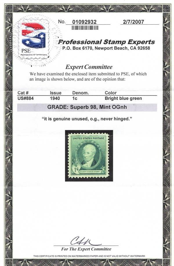 1940, 1¢ Gilbert Stuart (Scott 884), perfect in every respect, o.g., never hinged, Superb, with 2007 P.S.E. certificate graded SUP 98. SMQ $50.