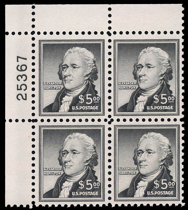 1956, $5 Hamilton (Scott 1053), plate block of 4, well centered, o.g., never hinged, Very Fine. Scott $210.