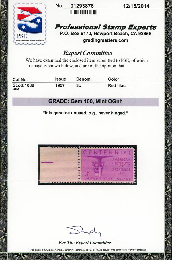 1957, 3¢ Architects (Scott 1089), o.g., never hinged, Superb, with 2014 P.S.E. certificate graded GEM 100. SMQ $160.