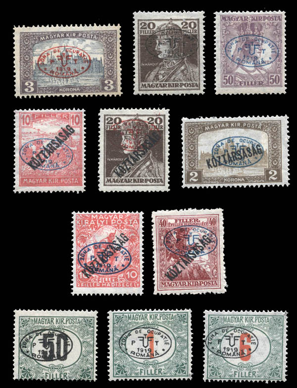 Lot 32![]() Hungary: Romanian Occupation, First Debrecen Issue, 1919, 11 different (Scott 2N20//2N45, etc.), including Nos. 2N20, 2N29a, 2N32, 2N38, 2N42a, 2N45, 2NB4, 2NB6, 2NJ1, 2NJ2 and 2NJ5, o.g., hinged, Fine to Very Fine. None are signed. Scott $645. Estimate $40 - 60. |