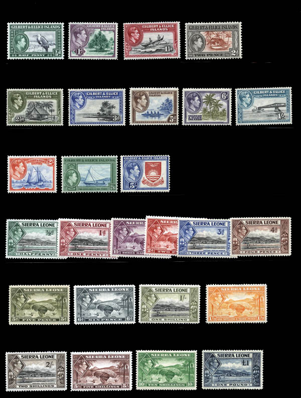 Lot 32![]() ![]() British Commonwealth, 1938-1960, King George VI and early Queen Elizabeth II, 8 different mint n.h. definitive sets. KGVI includes Gilbert & Ellice #40-51 ($57.50), Sierra Leone #173-185 ($150) and Southern Rhodesia #42-54 ($75). QEII includes Antigua #107-121 ($77.95), Ascension #62-74 ($143.20), Bechuanaland Protectora # 154-165 ($116.35), Pitcairns Islands # 20-30 ($52.30) and Sarawak #197-211 ($112.05). A nice clean group, Fine to Very Fine. Scott $784. Estimate $200 - 300. |