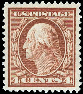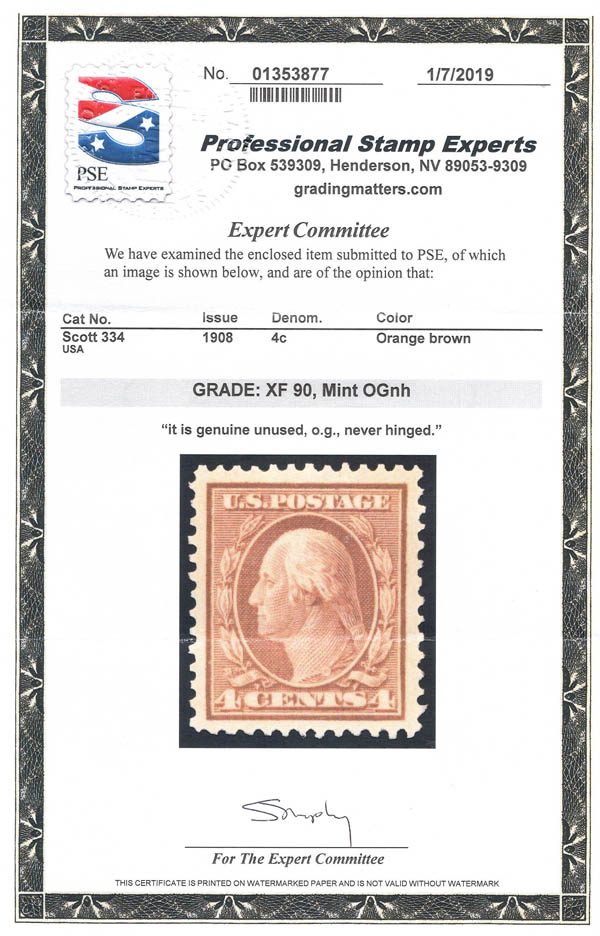 1908, 4¢ Washington, orange brown, D.L. watermark (Scott 334), o.g., never hinged, Extremely Fine, with 2019 P.S.E. certificate graded XF 90. Scott $88. SMQ $225.