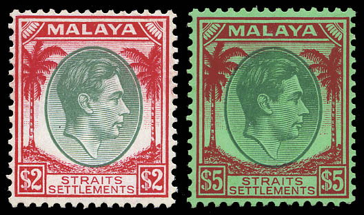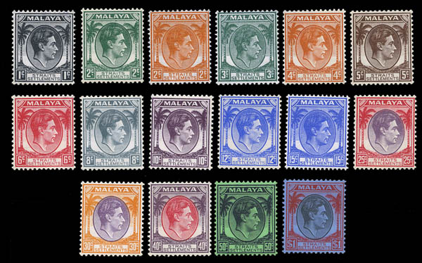 Lot 320![]() Malaysia: Straits Settlements, 1937-41, King George VI, 1¢ to $5 complete (SG 275/298. Scott 238-252), set of 18, o.g., mostly lightly hinged, Fine to Very Fine. SG £375 for n.h. ($480). Scott $206 for hinged. Estimate $80 - 120. |