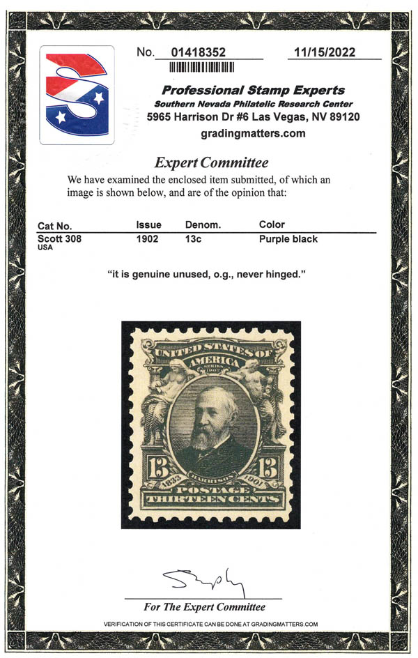 1902, 13¢ Harrison (Scott 308), lovely color and centering, o.g., never hinged, about Very Fine, with 2022 P.S.E. certificate. Scott $100.
