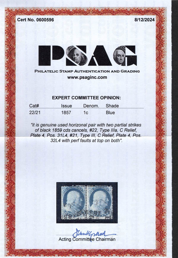 Lot 322 o 1857, 1¢ Franklin, blue, types III, IIIa (Scott 21, 22), horizontal combination pair, both Plate 4, position 32L4 (#21) and position 31L4 (#22), two partial strikes of 1859 c.d.s.'s; perf faults at top on both stamps, Very Good centering, with 2024 P.S.A.G. certificate. Scott $2,400. Estimate $400 - 600. |