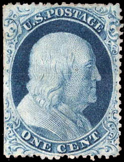 Lot 323 ( )1857, 1¢ Franklin, blue, type IIIa (Scott 22), well centered for this very difficult issue, unused without gum; perfs trimmed off at left and a light crease, otherwise Very Fine, with 2024 P.S.E. certificate. Scott $850. Estimate $300 - 400. |