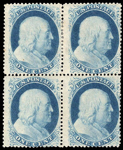 1857, 1¢ Franklin, blue, type V (Scott 24), block of 4, o.g., top pair hinged, bottom pair never hinged, Fine, with 2025 P.S.A.G. certificate. Scott $800.