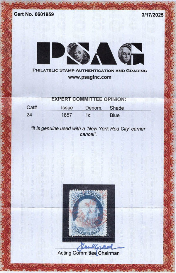 1857, 1¢ Franklin, blue, type V (Scott 24), a jumbo margined beauty, with premium New York City carrier cancel in red, Extremely Fine, with 2025 P.S.A.G. certificate. Scott $60.