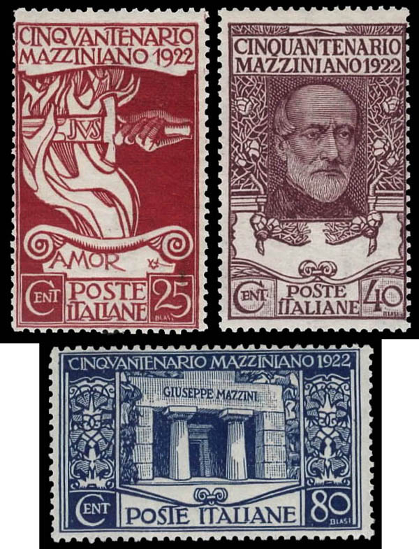 Italy, 1922, Mazzini complete (Scott 140-142), o.g., never hinged, Fine to Very Fine. Scott $130. Sassone 128-130.