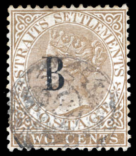 Lot 33 o Bangkok, 1882, "B" on Straits Settlements, 2¢ brown, Crown CA watermark (Scott 11), well centered, with a neat light cancel, Very Fine, signed twice. Scott $450. SG 14; £400 ($470). Estimate $120 - 150. |