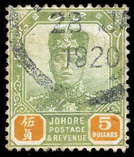 Malay States: Johore, 1918, Sultan Ibrahim, $5 green & orange, Multiple Crown CA watermark (SG 101. Scott 99), Very Fine used. SG £350 ($450). Scott $240.