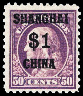 Offices in China, 1919, $1 on 50¢ light violet (Scott K15), very bright and fresh, o.g., paper hinge remnant, Fine to Very Fine. Scott $550.