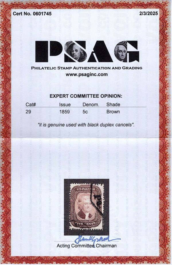1859, 5¢ Jefferson, brown, type I (Scott 29), fresh bright color, face-free Pennsylvania duplex cancels, about Fine, with 2025 P.S.A.G. certificate. Scott $325.