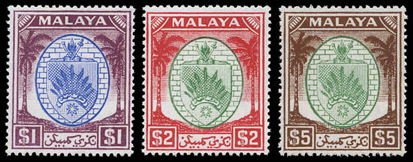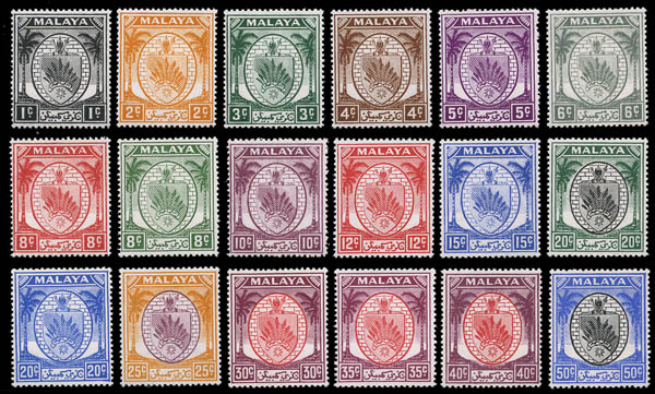 Malay States: Negri Sembilan, 1949-55, Arms, 1¢ to $5 complete (SG 42/62. Scott 38-58), set of 21, o.g., never hinged, Fine to Very Fine. SG £140 ($180). Scott $125.