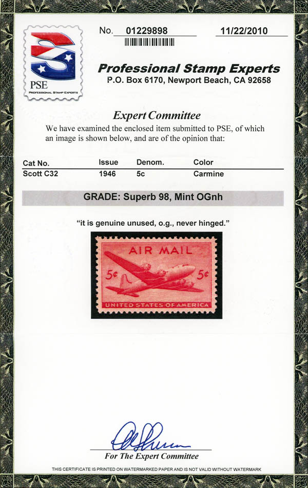 Airmail, 1946, 5¢ DC-4 Skymaster (Scott C32), o.g., never hinged, Superb, with 2010 P.S.E. certificate graded SUP 98. SMQ $125.