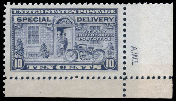 Lot 351![]() ![]() Special Delivery, 1922, 10¢ gray violet (Scott E12), a gorgeous corner margin single with siderographer's initials, beautifully well centered within oversized margins, o.g., never hinged, a Very Fine jumbo, with 2008 P.S.E. certificate graded VF 80J. Scott $95. SMQ $105. Estimate $100 - 150. |