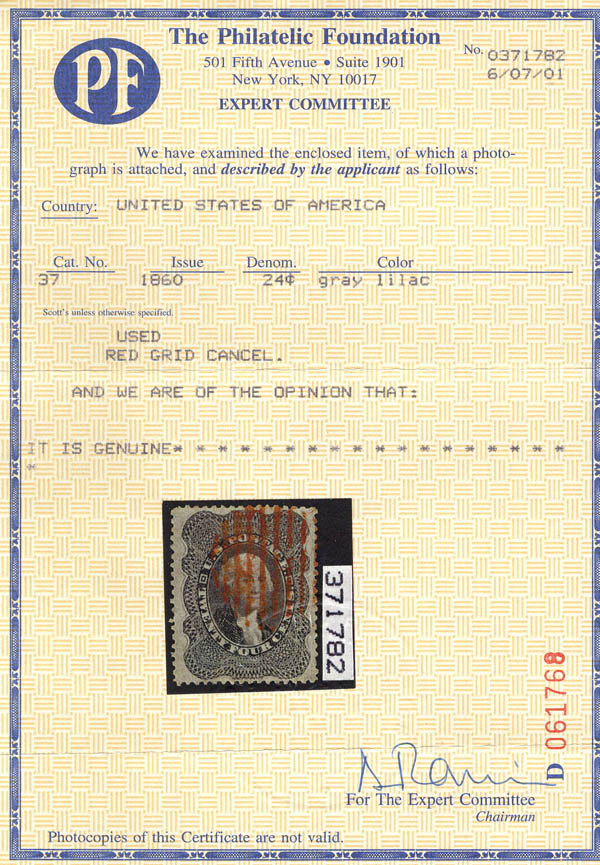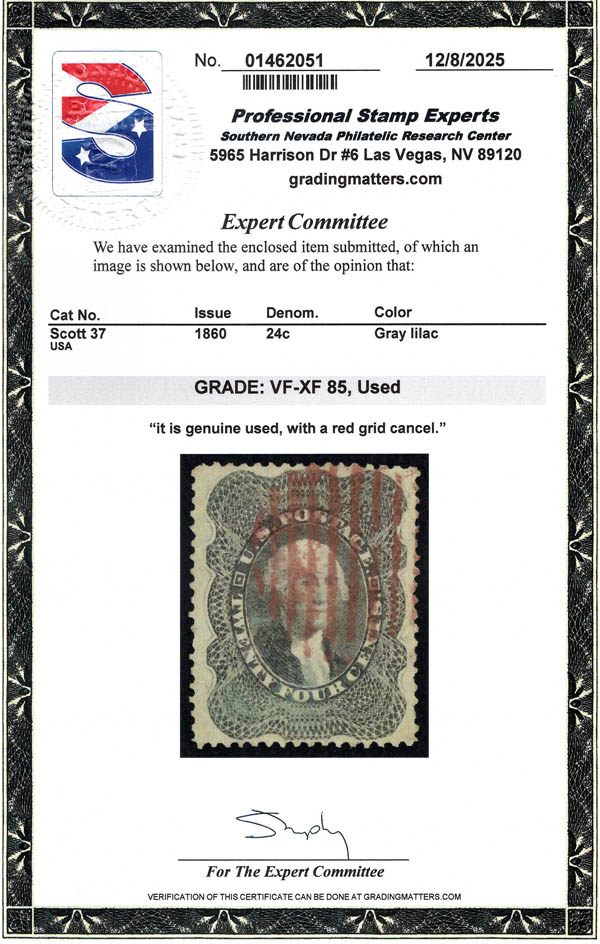 Lot 351 o 1860, 24¢ Washington, gray lilac (Scott 37), red grid cancel, Very Fine to Extremely Fine, with 2001 P.F. and 2025 P.S.E. certificates, the latter graded VF-XF 85. Scott $465. SMQ $550. Estimate $350 - 500. |