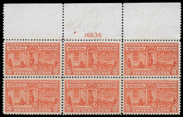 Lot 355![]() ![]() ![]() Special Delivery, 1925, 15¢ deep orange (Scott E13), a superlative plate block of 6, perfectly centered throughout, and with brilliant fresh color, o.g., never hinged, Extremely Fine, very scarce in such outstanding condition. Scott $700. Estimate $400 - 600. |