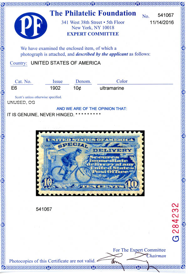 Special Delivery, 1902, 10¢ ultramarine (Scott E6), o.g., never hinged, nearly Very Fine, with 2016 P.F. certificate. Scott $500.