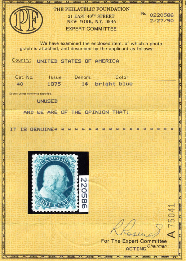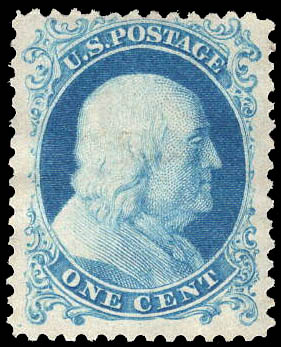 1857-60 (1875 Reprint), 1¢ Franklin, bright blue (Scott 40), radiant color, without gum as issued, Fine to Very Fine, only 3846 sold. Scott $650.
